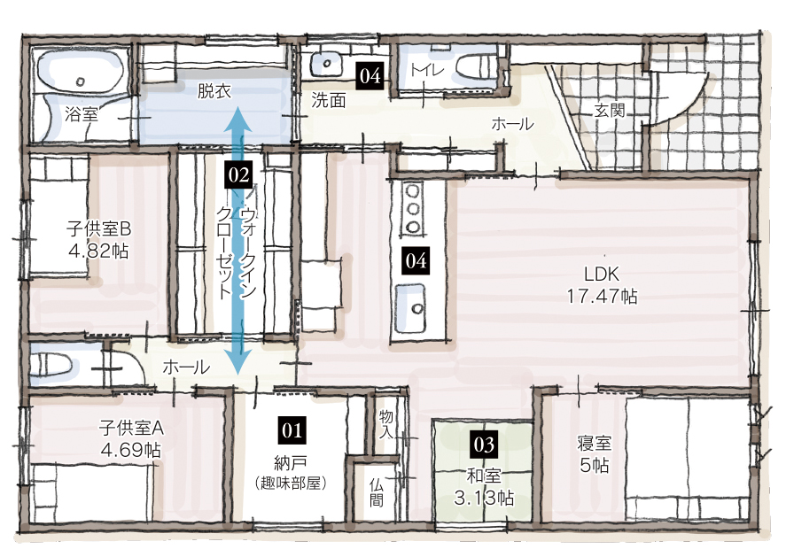 ウォークインクローゼット 「洗う・干す・直す」を一直線につなぎ、無駄をなくした家事ラク動線。