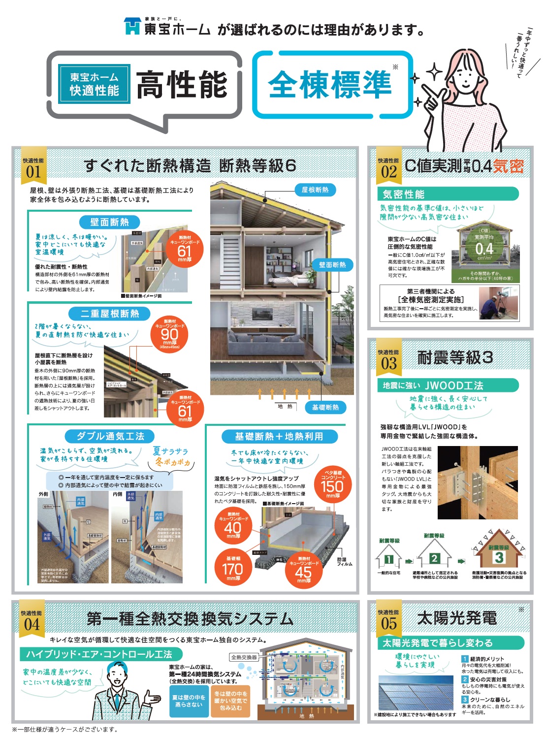 ③長く住める家づくり:全棟が長期優良住宅仕様。初期20年保証+最大60年まで延長可能で安心!