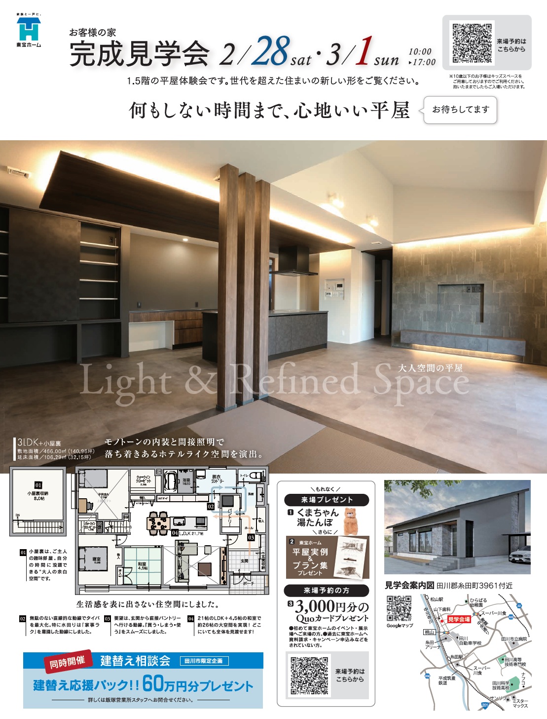 「1.5階の平屋体験会です。世代を超えた住まいの新しい形をご覧ください。」