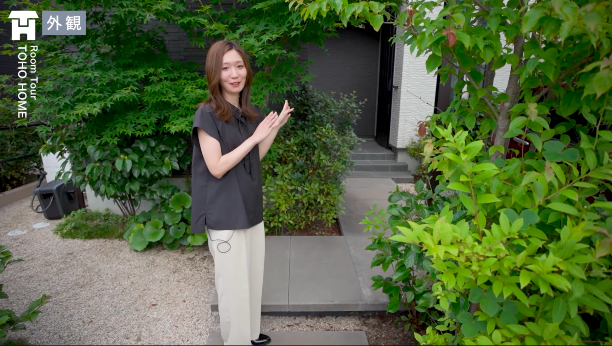 玄関へと続くアプローチは、タイルを浮かせるように配置することで、高級感のある仕上がりに。