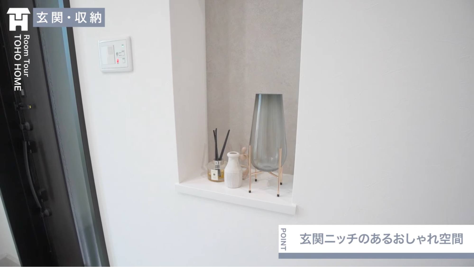 壁面のニッチにお気に入りの小物を飾って、玄関に香りと彩りをプラス。