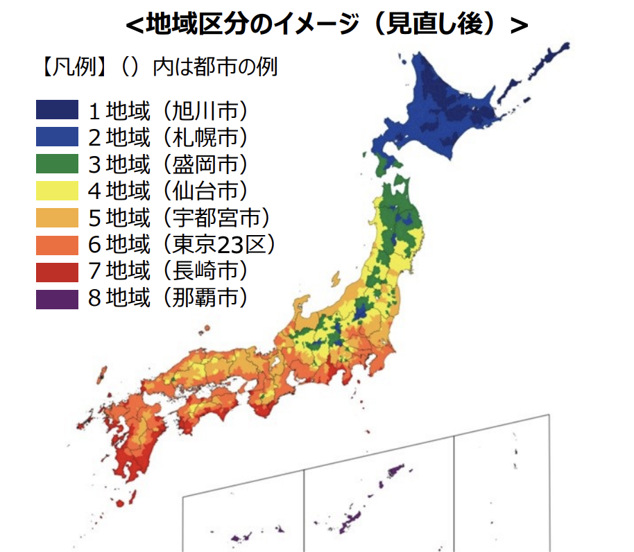 日本は南北に長く、地域によって気候が大きく違うため、UA値の基準も地域ごとに定められています。