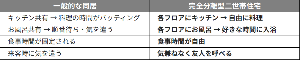 完全分離型と一部共有型二世帯住宅:完全分離型は各フロアにキッチン・お風呂を完備。初期費用は上がるが、「気を遣わない」暮らしが実現。長期的にはストレスが少なく、良好な関係が続く。