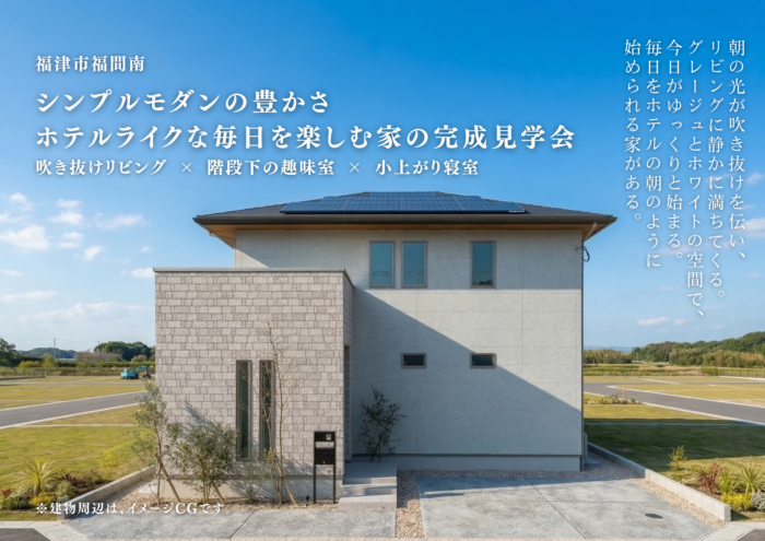 完成・構造見学会イベント【完成見学会in福津市福間南】収納と動線も見どころ。シンプルモダンの豊かさ・ホテルライクな毎日を楽しむ家 |