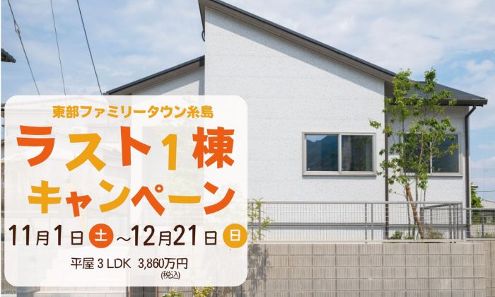キャンペーン【11/1(土)~12/21(日)】東部ファミリータウン糸島 ラスト1棟キャンペーン|マックカード500円分プレゼント!|抽選で家電プレゼント!期間11/1(土)~12/21(日) 会場東部ファミリータウン糸島 7号地 |