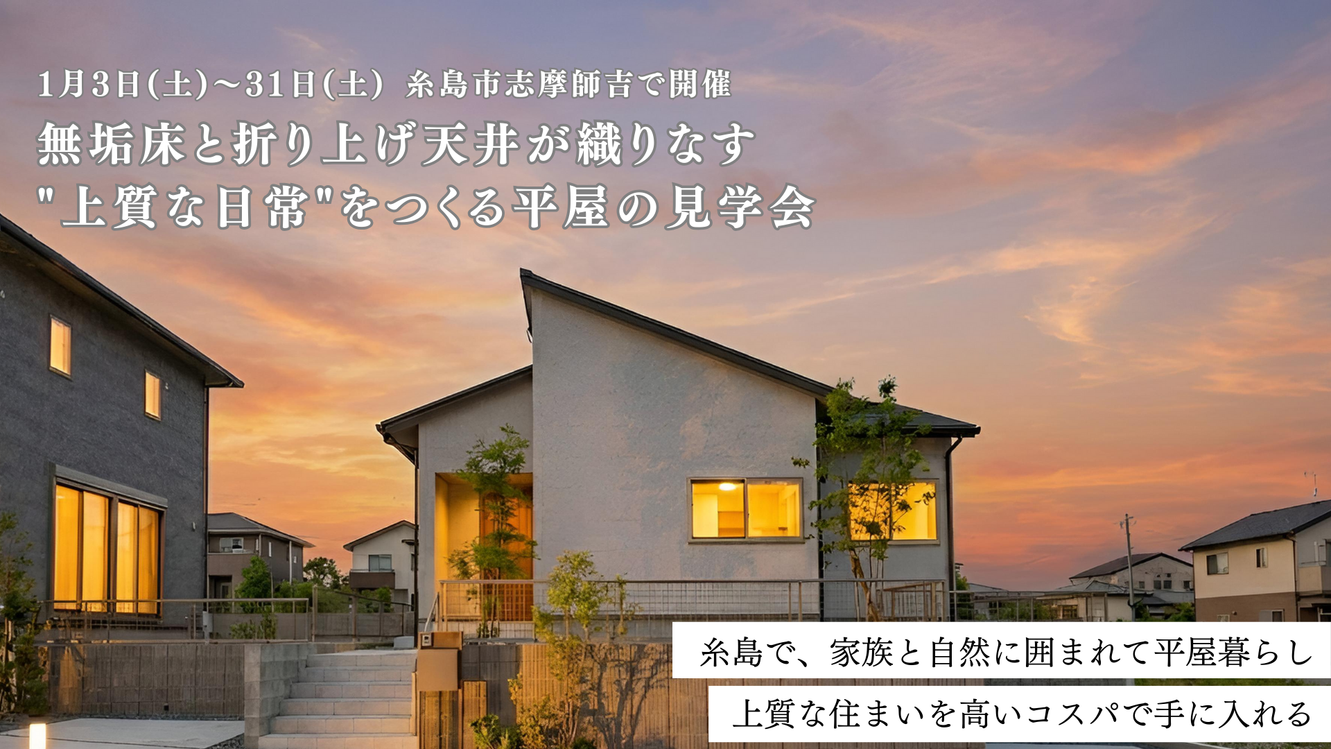 キャンペーン完成・構造見学会イベント【糸島市志摩師吉】平屋の見学会 無垢床と折り上げ天井が織りなす”上質な日常”期間1月3日(土)~1月31日(土) 会場糸島市志摩師吉(※詳細な地図はご予約後にお送りします) |