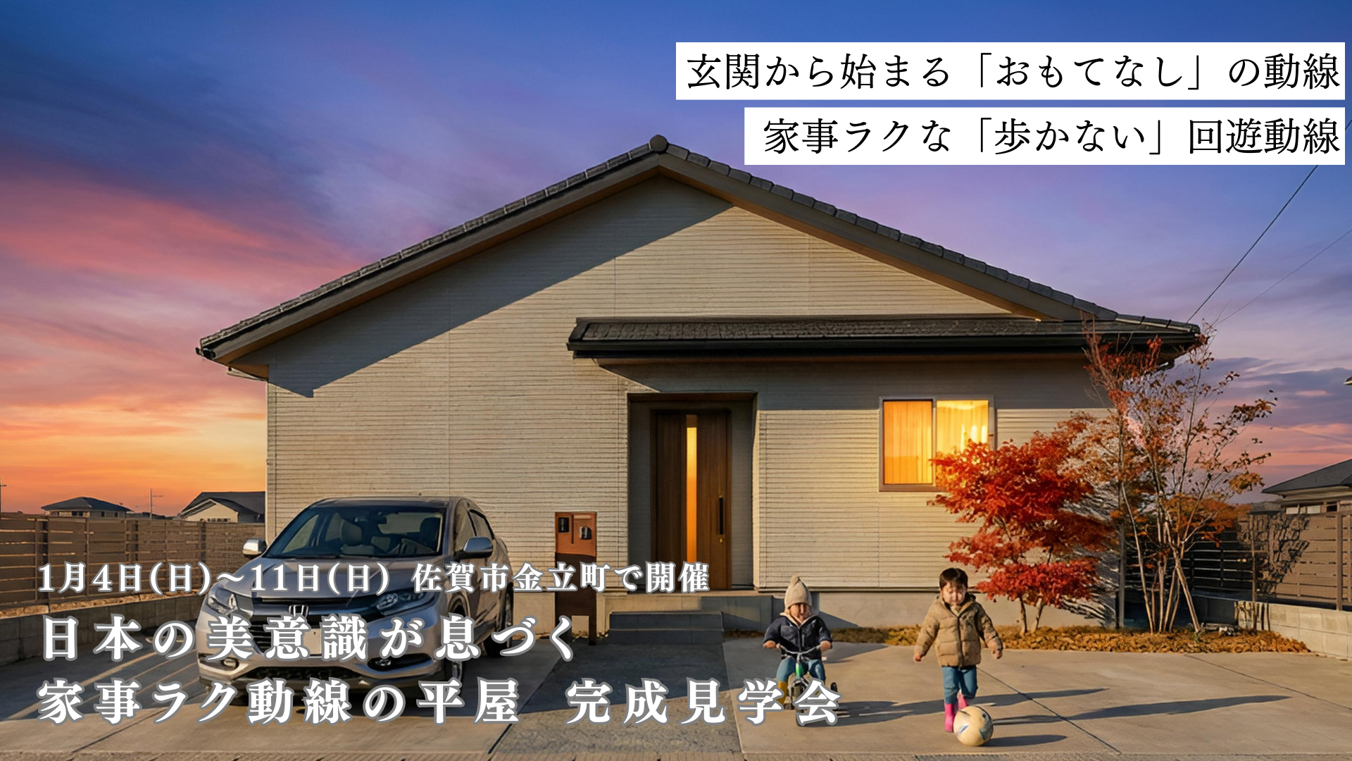 完成・構造見学会イベント完成見学会 日本の美意識が息づく家事ラク動線の平屋 佐賀市金立町で開催期間1月4日(日)~1月11日(日)1週間限定 会場佐賀市金立町(詳細な住所はご予約後にお伝えします) |