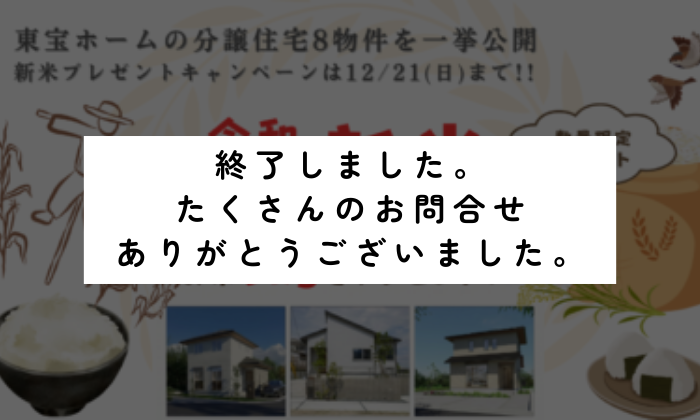 キャンペーンイベント【見学も気軽に!!】街と住まいの特別フェア~年内最後のビッグチャンス。東宝ホームの分譲住宅8物件を一挙公開~期間10月25日(土)〜12月28日(日) 会場ご見学またはご契約希望物件 |