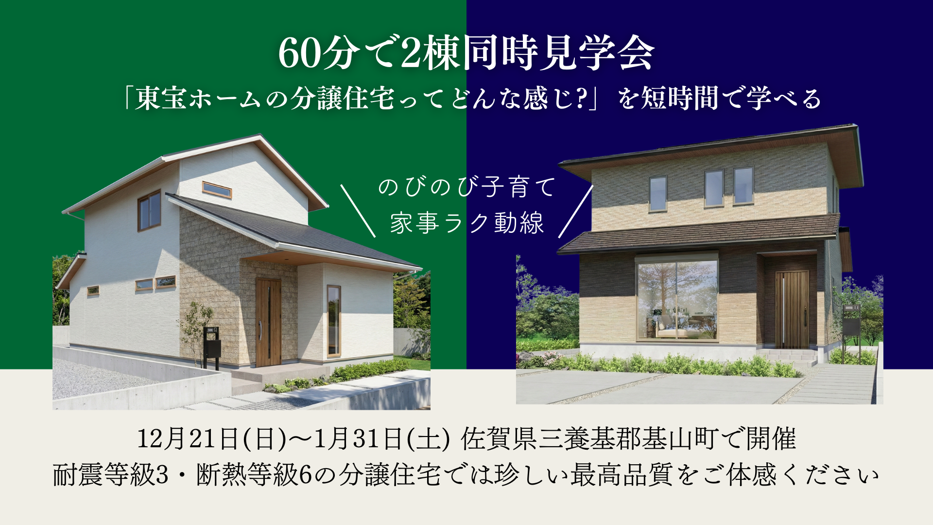 キャンペーンイベント60分で2棟同時見学会!!「東宝ホームの分譲住宅ってどんな感じ?」断熱等級6×耐震等級3の最高性能分譲住宅期間12月21日(日)~1月31日(土) 会場ガーデンヴィラ基山 21号地&23号地 ≪JR鹿児島本線・甘木鉄道「基山」駅≫車で約5分 |