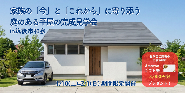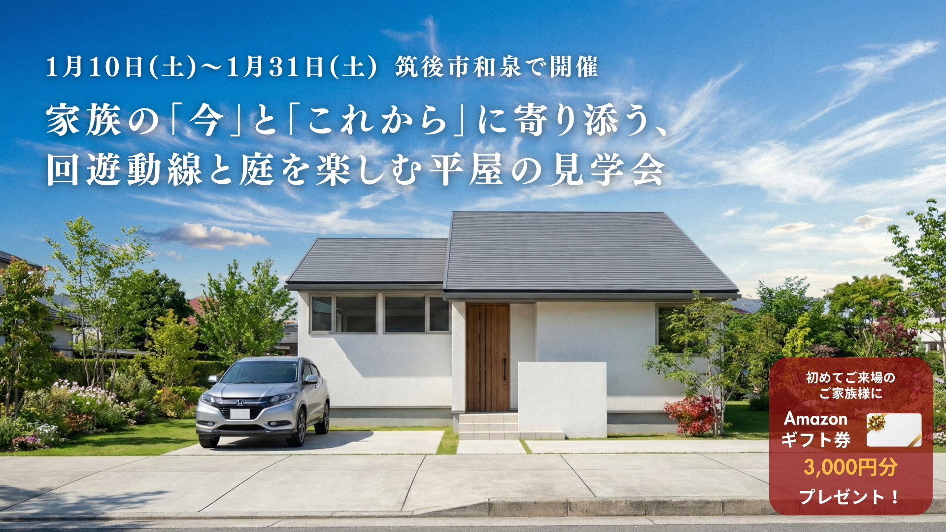 完成・構造見学会【筑後市和泉】総額3,500万円で叶った 家族の「今」と「これから」に寄り添う、 回遊動線と庭を楽しむ平屋の見学会期間1月10日(土)~2月1日(日) 会場筑後市和泉(※詳細な地図はご予約後にお送りします) |