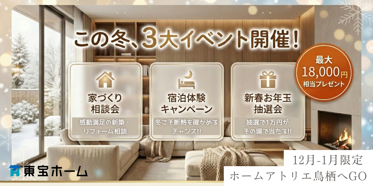 キャンペーンセミナー・相談会イベント【鳥栖店】新築&リフォーム相談 【期間限定イベント】冬こそ「性能」を体感!宿泊体験キャンペーン&ハズレなしの新春お年玉大抽選会開催! ~1万円分のAmazonギフト券が当たる!フレスポ鳥栖へGO!~期間12月20日~ 会場ホームアトリエ鳥栖(フレスポ鳥栖内1階) |