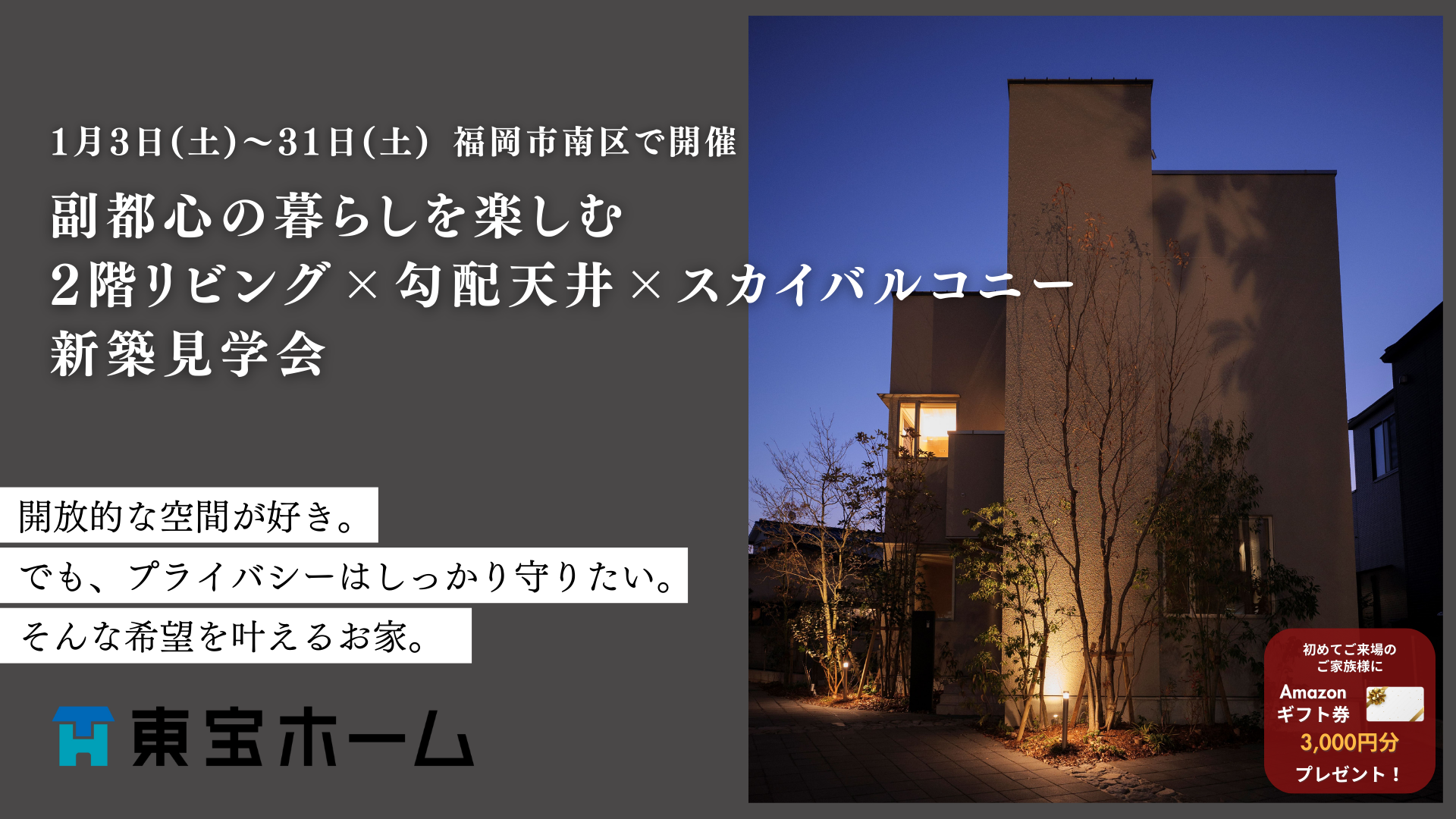 完成・構造見学会イベント【福岡市南区】副都心の暮らしを楽しむ 2階リビング×勾配天井×スカイバルコニーの新築見学会期間1月3日(土)~1月31日(土) 会場福岡市南区大橋(詳細な住所はご予約後にお伝えします) |