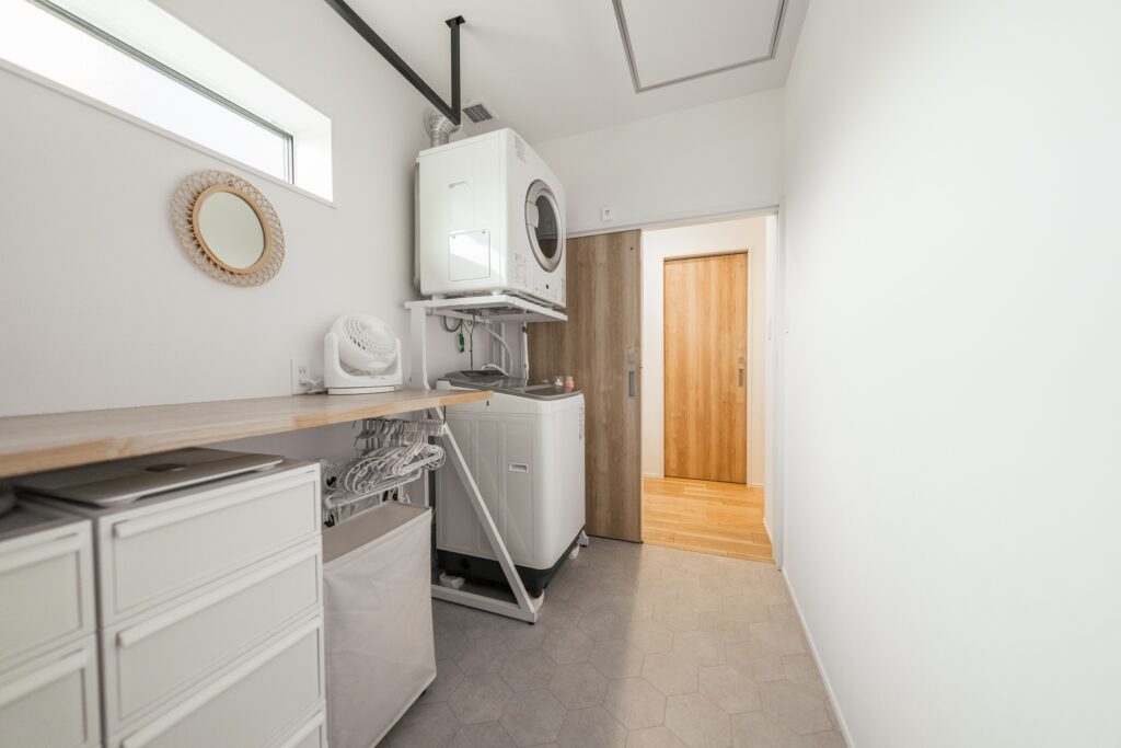 洗う→干す→畳むを一室で完結。物干し・畳み台・収納の近接計画で家事時間を圧縮。
