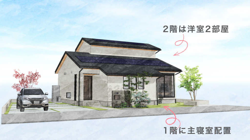 「半分平屋(はんぶんひらや)」:2階建てでありながら、1階だけで生活のすべて(LDK・お風呂・主寝室)が完結する間取りのことです 。 「平屋を建てたいけど敷地が足りない」「総二階よりコストを抑えたい」という方に人気のスタイル。子供が巣立った後の30〜40年後は、階段を使わず平屋のように暮らせるのが最大のメリットです 。