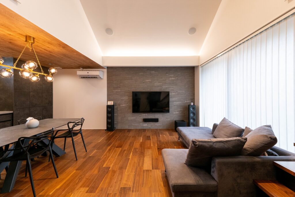 LDKの主役は、家具のように美しいキッチン「グラフテクト」。今回は作業動線が短く、複数人で料理もしやすい人気の「Ⅱ型(セパレート)」を採用しました。リビングには調湿・脱臭効果のある「エコカラット」を貼り、壁掛けテレビと間接照明を組み合わせることで、夜はバーのような落ち着いた雰囲気を演出します。(写真は類似事例です)