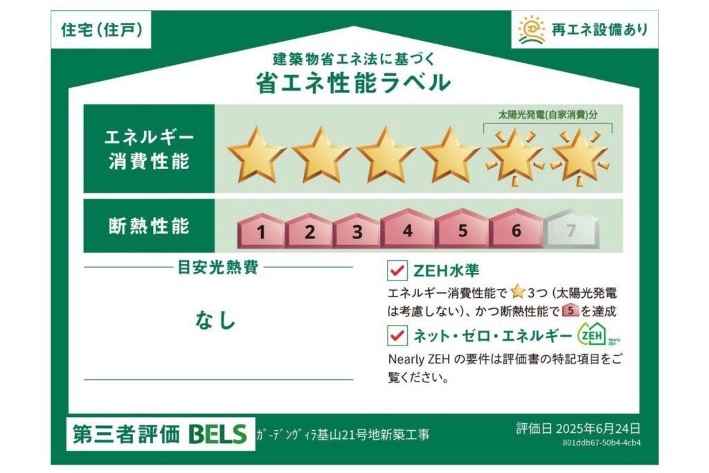 省エネ性能ラベル:住宅の省エネ性能や省エネ水準の達成度が記載されているラベルです。星のマークが増えるほど、省エネ性能が高いことを示し、家のマークが増えるほど、断熱性能が高いことを示しています。