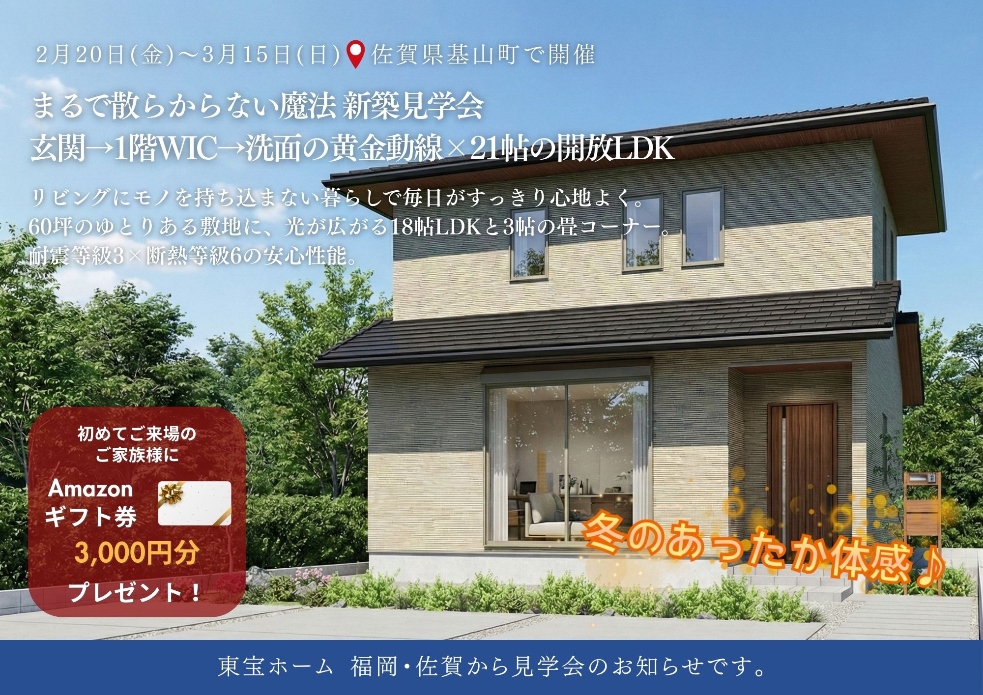 東宝ホーム 福岡・佐賀イベント情報完成・構造見学会【佐賀県基山町】まるで散らからない魔法 玄関→1階WIC→洗面の黄金動線×21帖の開放LDK 新築見学会