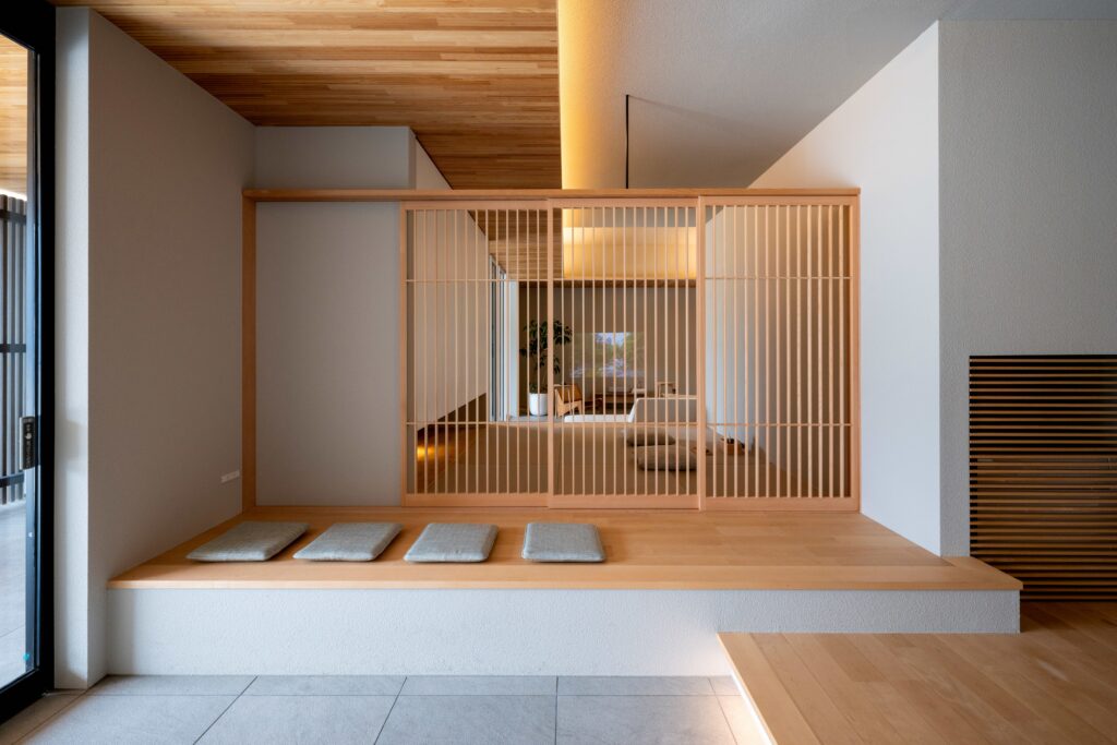 玄関の扉を開けると、そこには二つの動線が。「家族用」の廊下へ続く道と、そのまま「小上がり和室」へお客様を通せるおもてなしの道。 LDKと緩やかにつながる和室は、日本旅館のような情緒を演出しつつ、将来はご両親の寝室としても使えるゆとりを確保。客間として、お子様のお昼寝スペースとして、そして将来の二世帯の備えとして。美しさと機能性を兼ね備えた設計です。(写真は類似事例です)