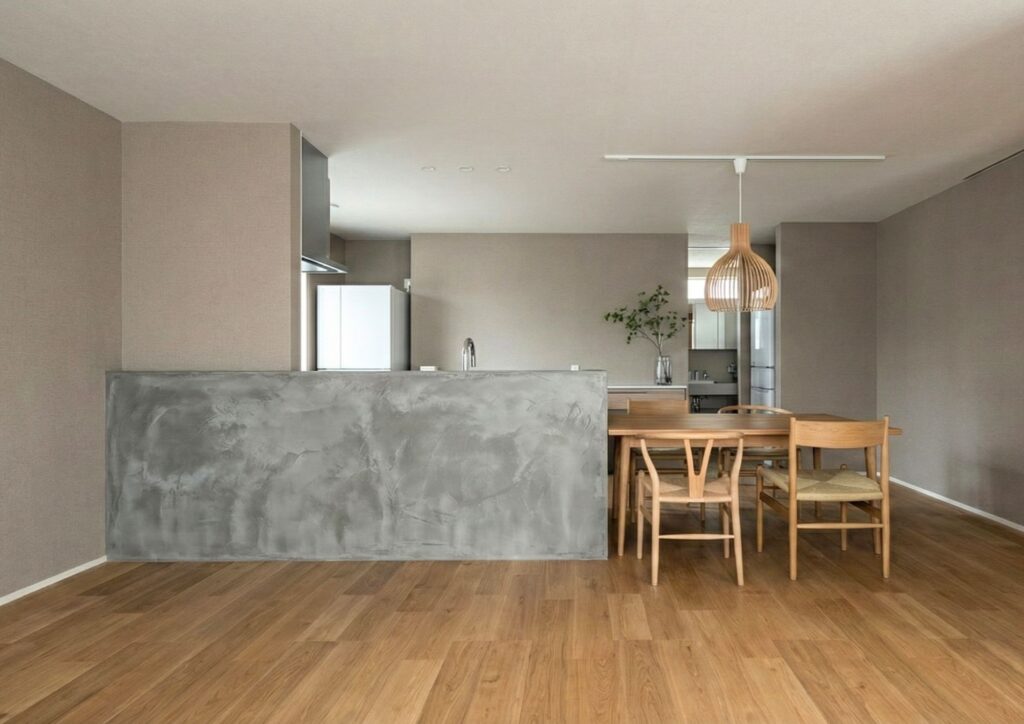 キッチン腰壁部に、本物のモルタルのような無機質で上質な素材感のモルタルアートを施工。職人の手仕事による陰影で、表情豊かで温かみのある、シックで高級感のある空間を作り出します。(イメージCGです)