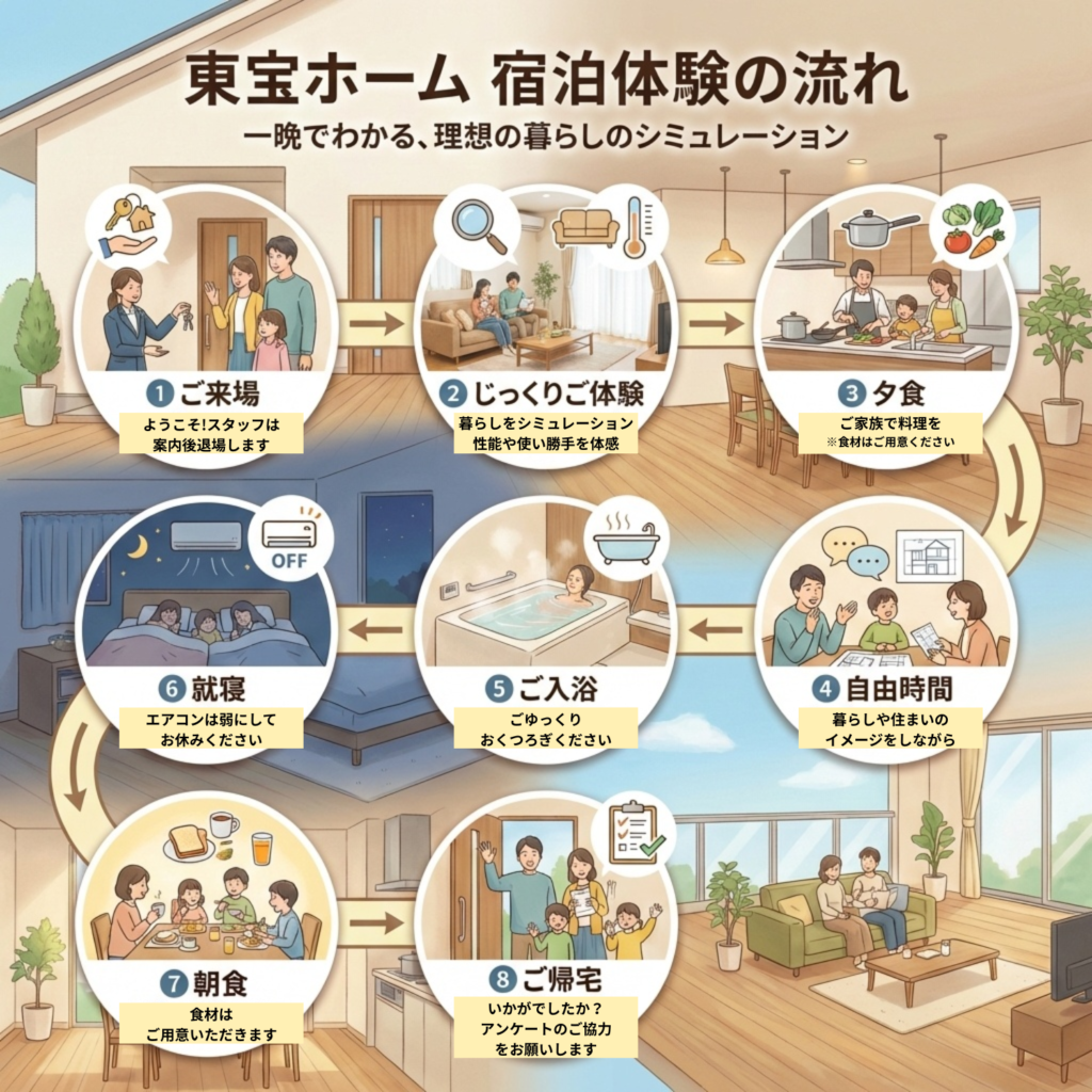 カタログやモデルハウス見学では分からない、東宝ホームの「本当の住み心地」を、1泊2日で体感してください。