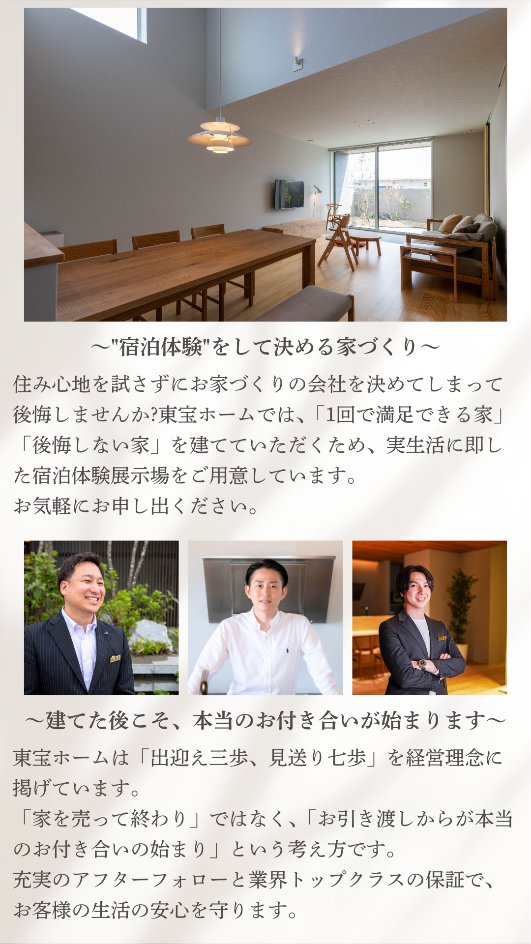 東宝ホームが自信を持ってお伝えできる「高品質」「長期優良」「安心な保証」「宿泊体験」の4つのポイントを詳しく紹介します。