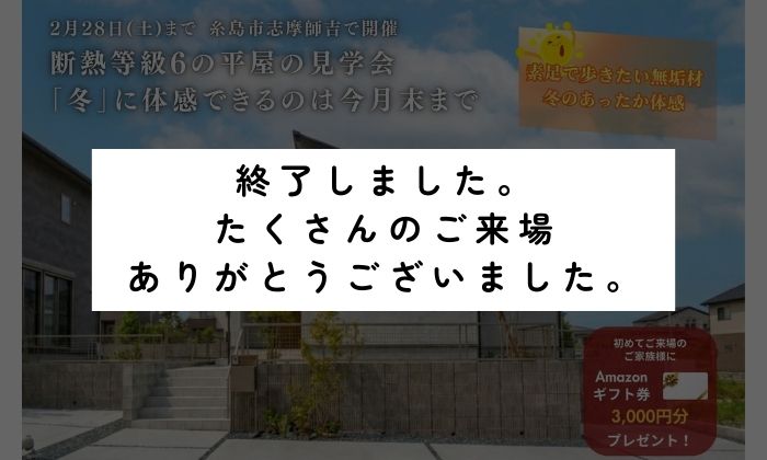 キャンペーン完成・構造見学会イベント(終了)【糸島市志摩師吉で開催】素足で歩きたい無垢材・断熱等級6の平屋の見学会 「冬」に体感できるのは今月末まで期間1月3日(土)~2月28日(土) 会場糸島市志摩師吉(※詳細な地図はご予約後にお送りします) |
