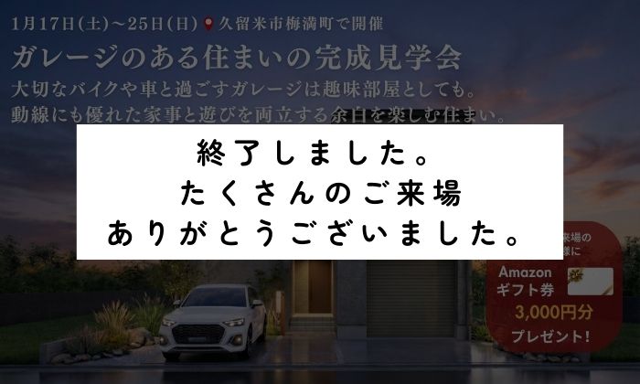 完成・構造見学会【筑後市和泉】総額3,500万円で叶った 家族の「今」と「これから」に寄り添う、 回遊動線と庭を楽しむ平屋の見学会期間1月10日(土)~2月1日(日) 会場筑後市和泉(※詳細な地図はご予約後にお送りします) |