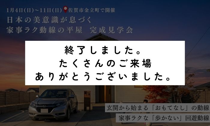 完成・構造見学会イベント(終了)完成見学会 日本の美意識が息づく家事ラク動線の平屋 佐賀市金立町で開催期間1月4日(日)~1月11日(日)1週間限定 会場佐賀市金立町(詳細な住所はご予約後にお伝えします) |