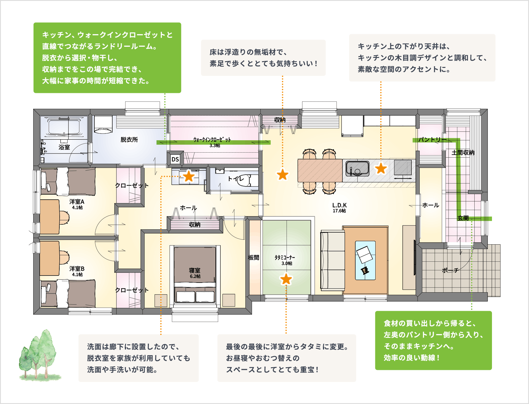 すべての生活空間が同じフロアにある平屋は、日常動線がシンプルで暮らしやすさ抜群。朝の身支度も戸締まりも移動が最小限で済み、掃除も忘れ物を取りに行くのもラク。廊下などのデッドスペースが少なく、広々としたLDKや充実した収納スペースを効率よく確保できます。