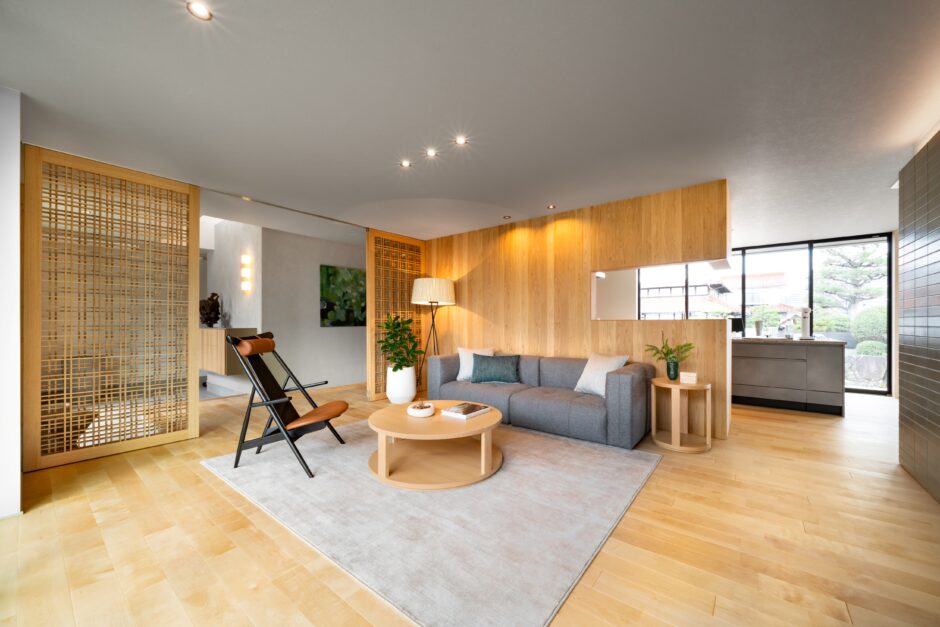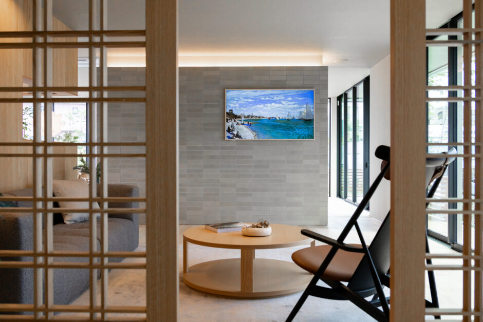 重ねると組子風となる建具とインテリアの一部にもできる絵画風壁掛けテレビ