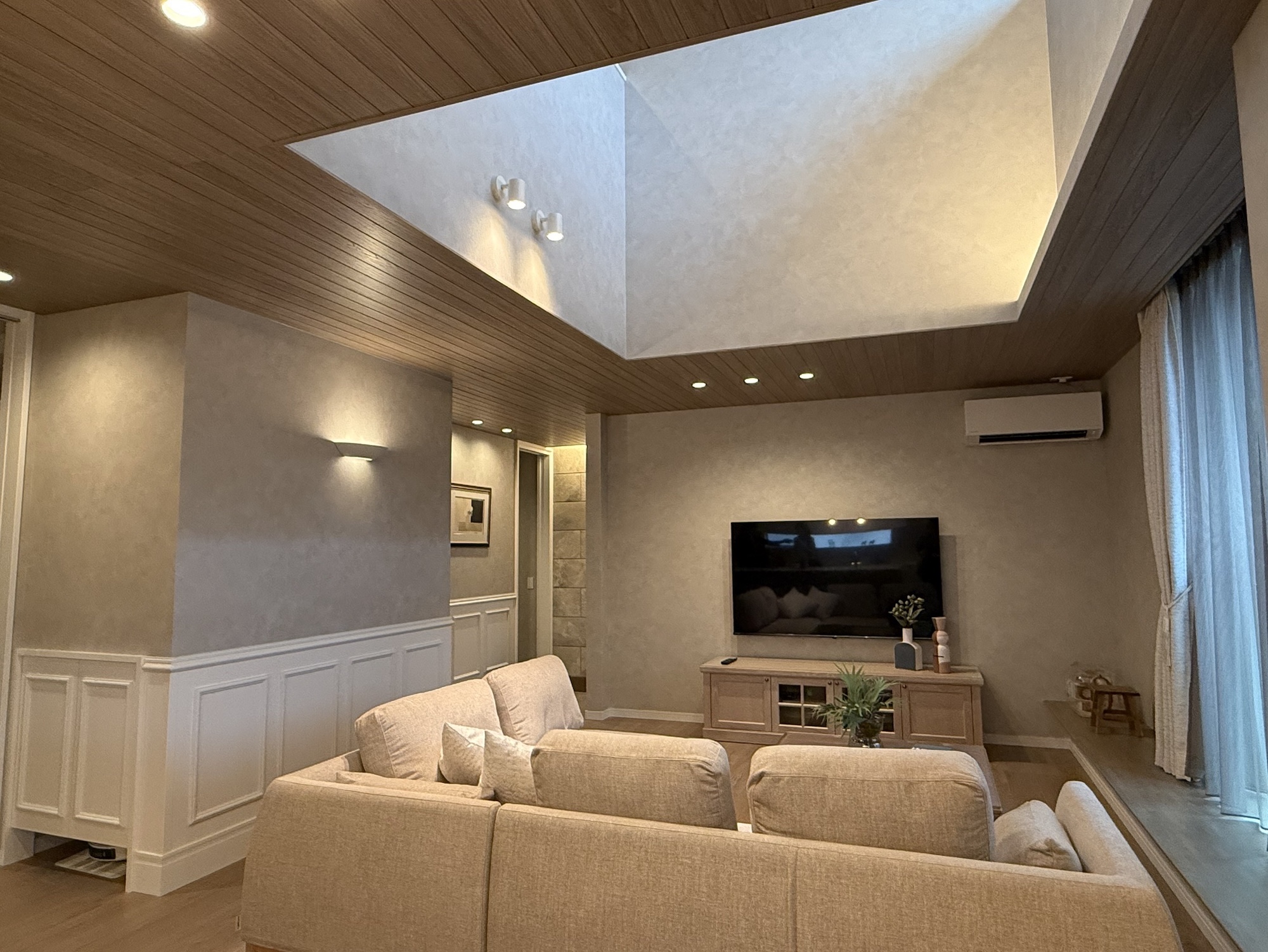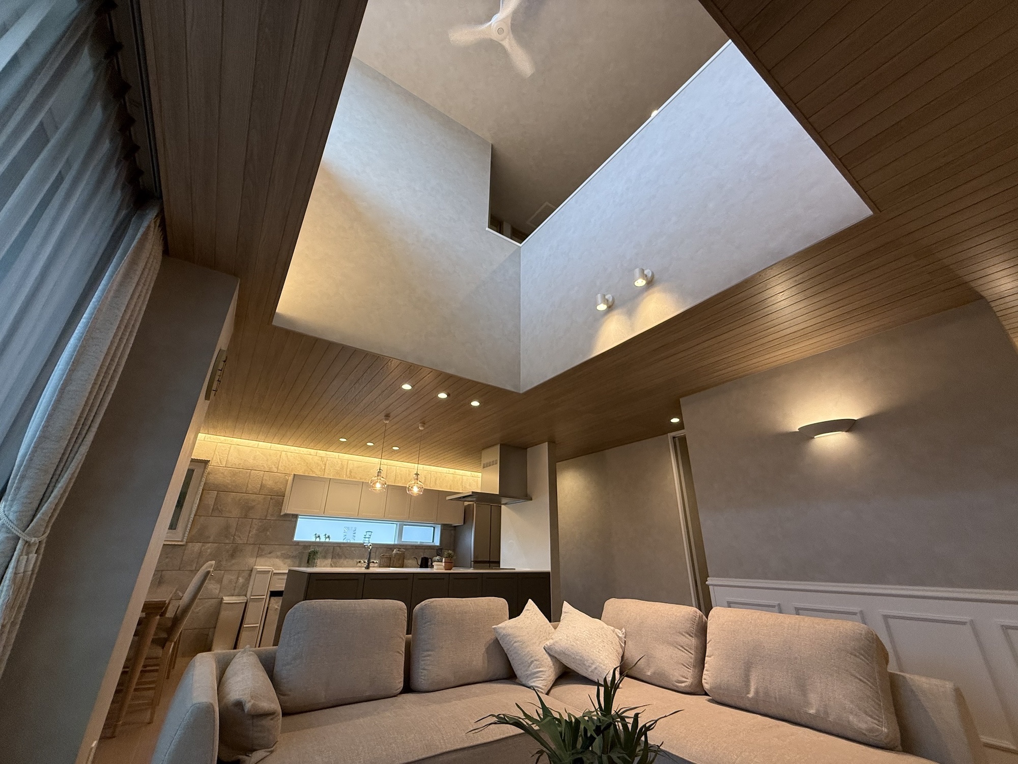 天井は木目デザインにすることで、温もりあふれる雰囲気に。リビング中央の吹き抜けが、空間に明るさと開放感をもたらしてくれています。