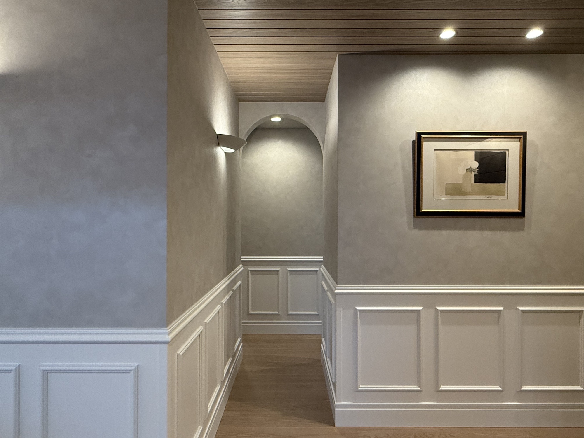 こちらのLDKには、ヨーロッパの邸宅によく見られるパネルモールディング(写真の白い腰壁)を採用し、高級感のあるクラシカルな内観を実現。そこに柔らかな印象を与えるR壁(アーチ壁)や、近代的なデザインの半円照明をプラスし、さりげなくモダンなテイストを融合させています。
