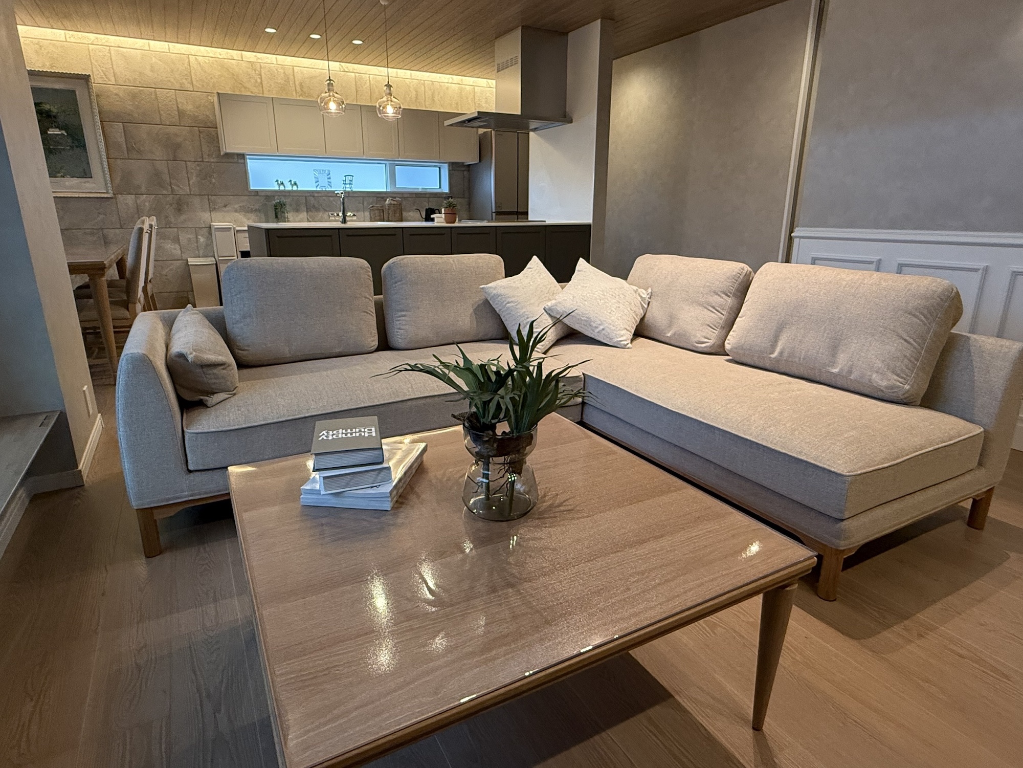 ソファはAD COREさんの「ネオクラシコ」シリーズ。インテリアの雰囲気に合うフランネルソファです。