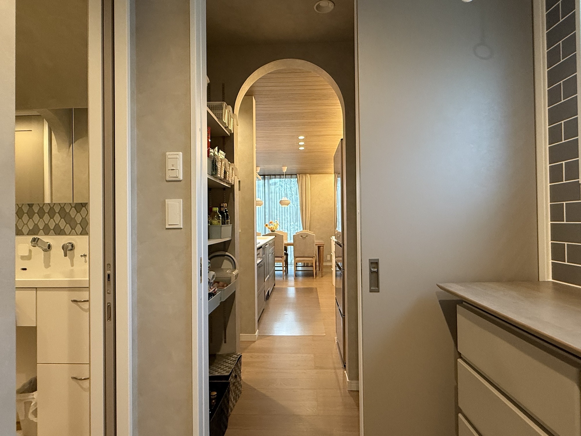 K様邸は玄関からシューズクローク、ファミリークローク、洗面室・脱衣室、パントリー、LDKを回遊できる造りになっています。そのためどこへ行くにもスムーズに移動でき、家事の時短が叶います。