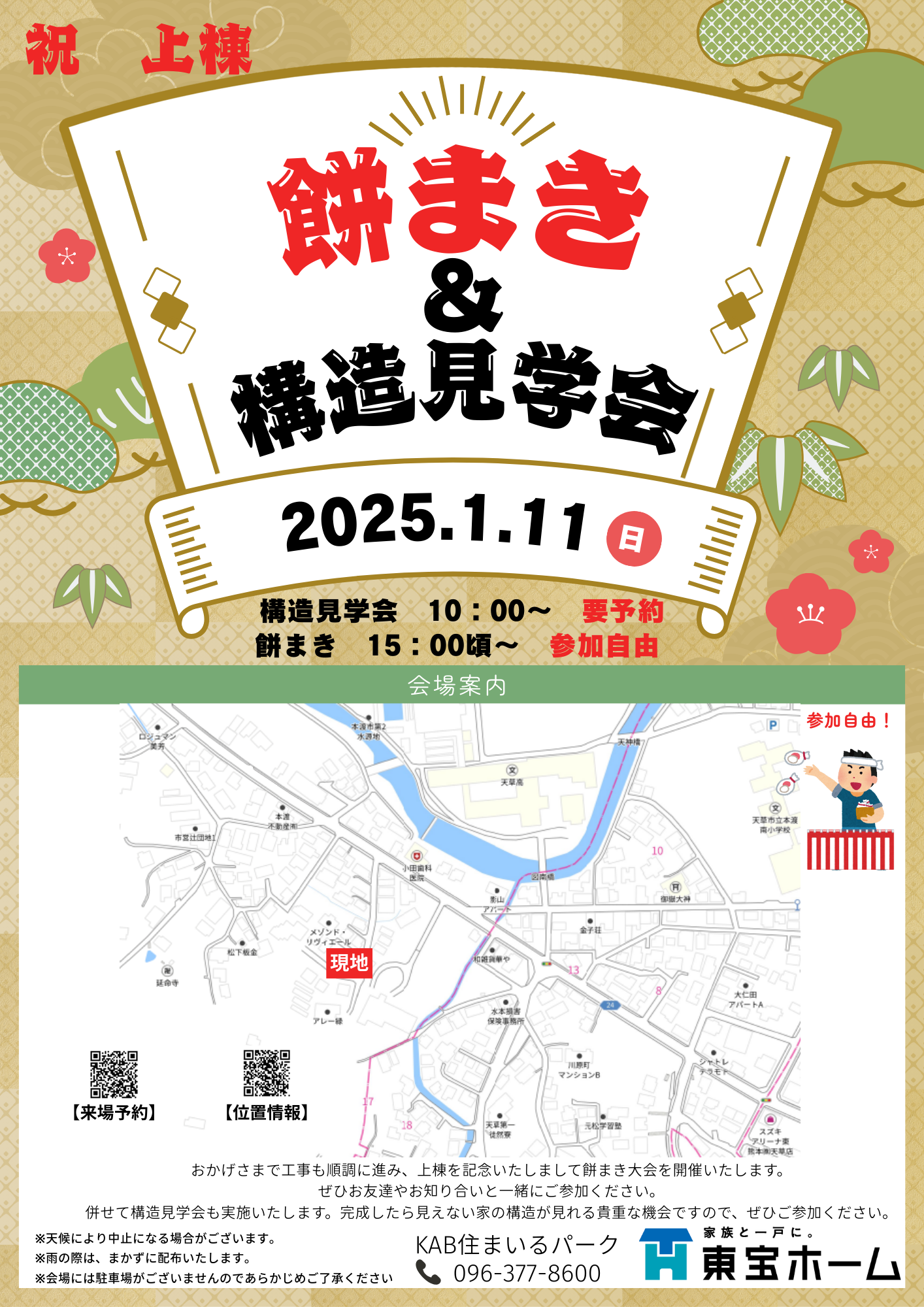 餅まきとは:家の上棟が無事完了したことのお祝いに、屋根の上から餅などをまき、近隣住民に「福」を分け与え、工事の安全や家内安全、五穀豊穣を願う伝統行事です。