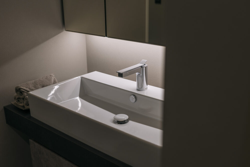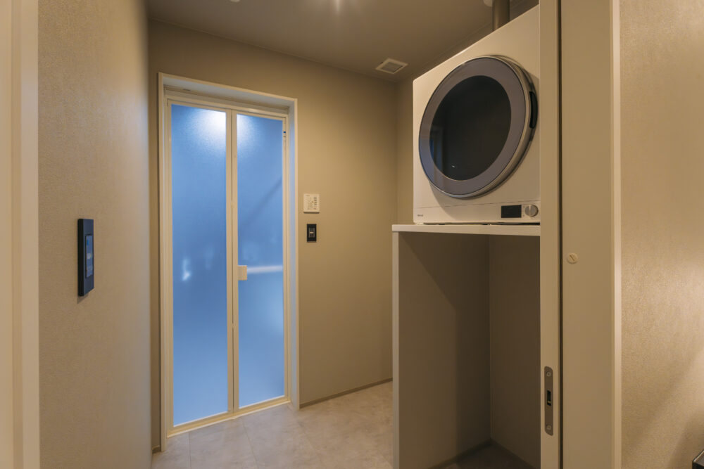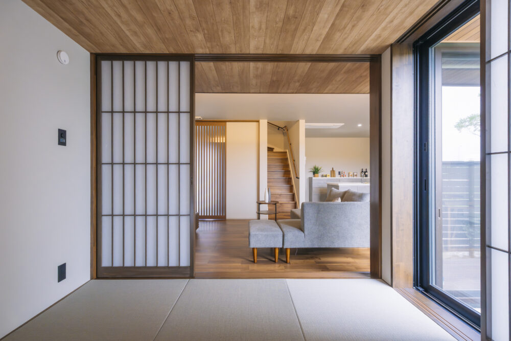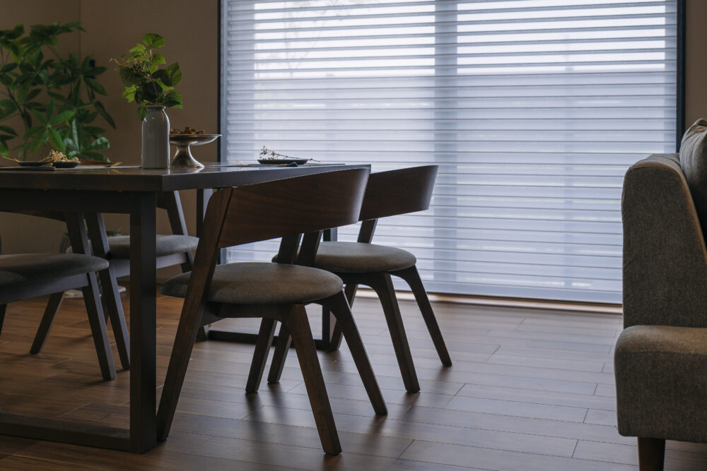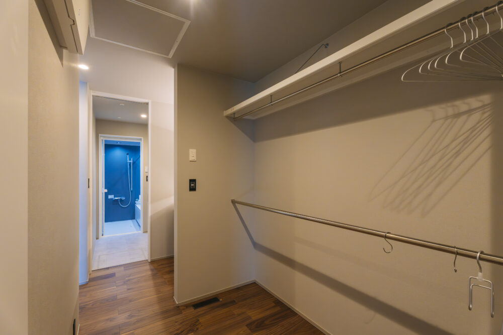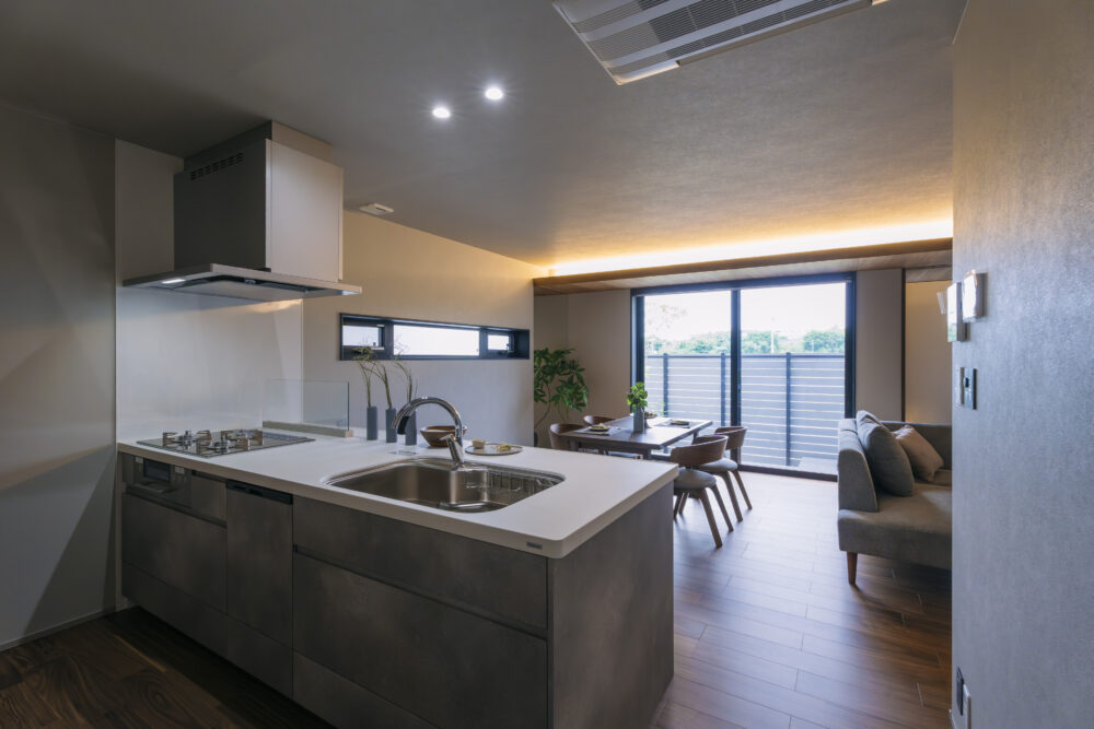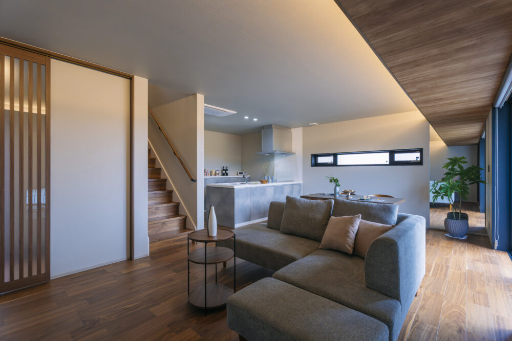 ウォールナットカラーで統一され、落ち着きのある内装デザインの中に、アクセントとして造作洗面やキッチンでグレーカラーを取り入れました✨玄関から土間収納、ファミリークローク、洗面までの便利な動線も確保された間取りとなっております。